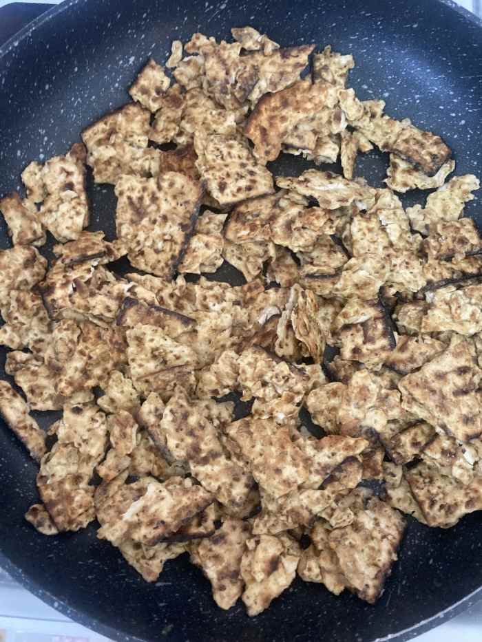 2. מערבבים בצורה יסודית עד שכל התערובת מרוחה באופן אחיד על כל המצות ולא רואים מצות יבשות בקערה. זה תהליך שיכול לקחת 2-3 דק אפילו.