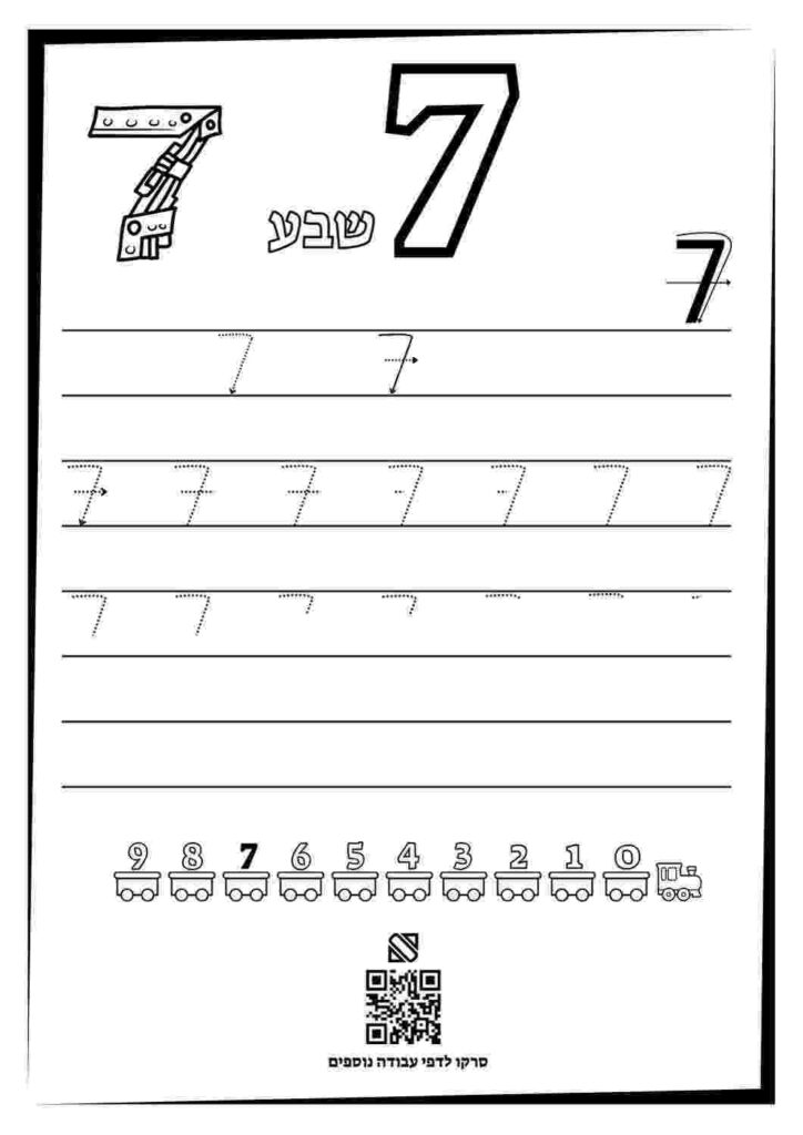 - המספר-7 דפי לימוד לכתוב ספרות 0-9